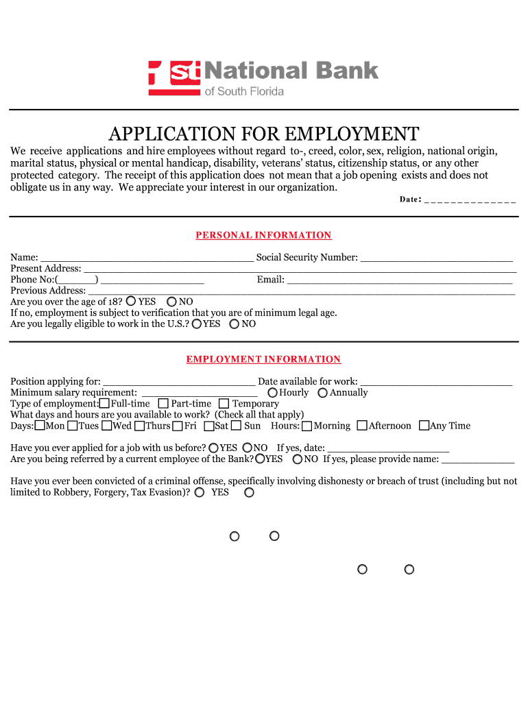 The Employment Application Form is essential for all job seekers applying for positions at the 1st National Bank of South Florida or similar organizations. This form is necessary for various roles, ranging from entry-level positions to more advanced banking roles. It is crucial for applicants to understand the eligibility criteria and specific job conditions that may require submission of this form.