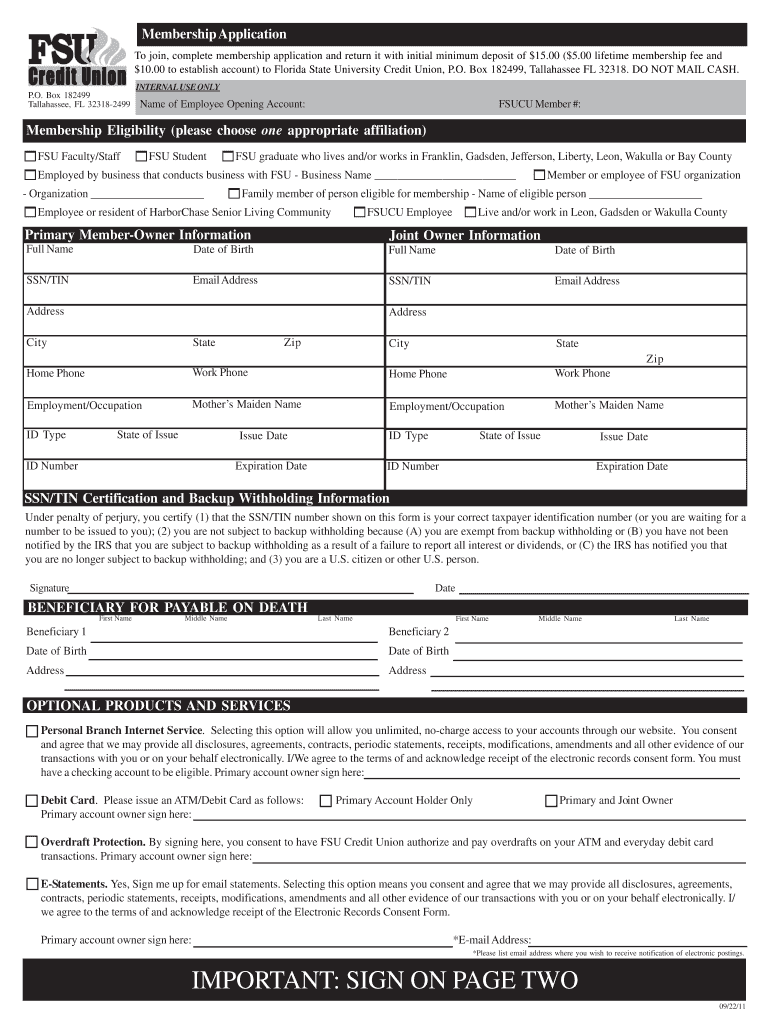 The Membership Application is a business form used by individuals to join the Florida State University Credit Union.