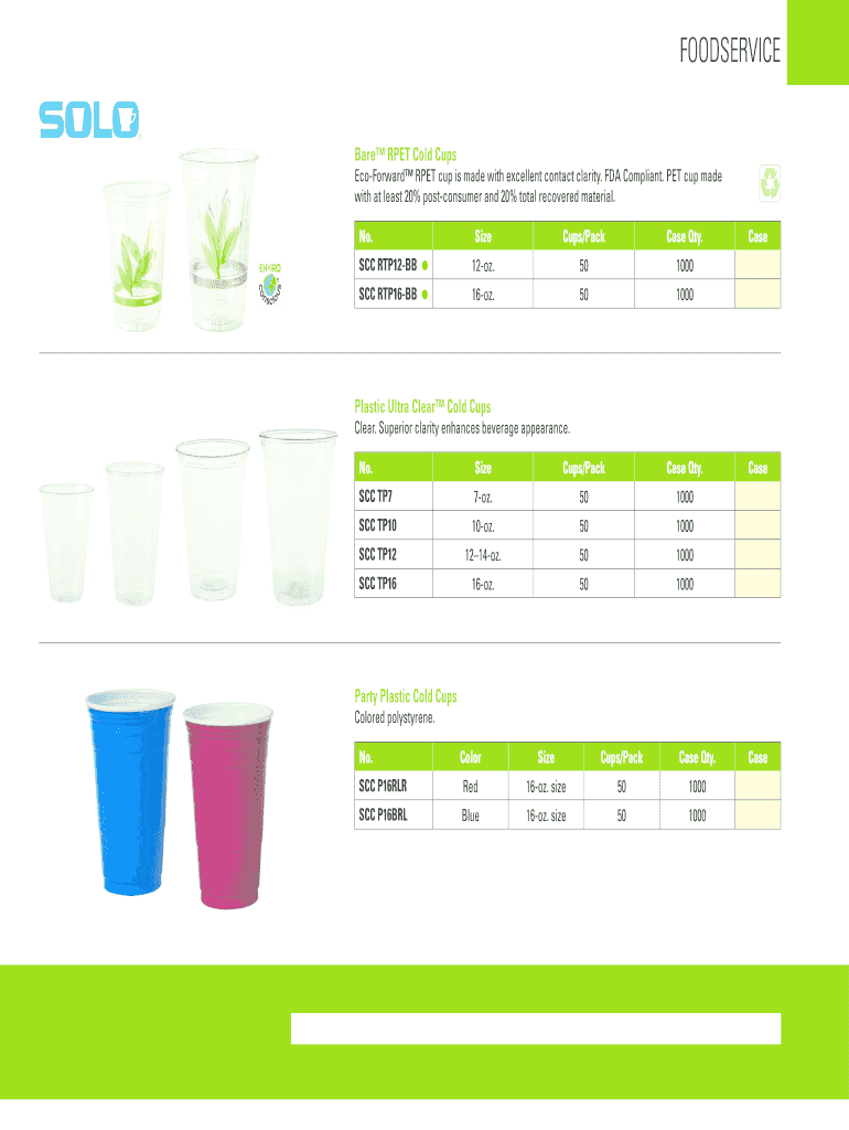 FOODSERVICE Bare PET Cold Cups Forward PET cup is made with excellent contact clarity. FDA Compliant. PET cup made with at least 20% postconsumer and 20% total recovered material. No. Size Cups/Pack