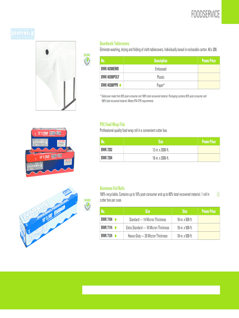 FOODSERVICE Boardwalk Table covers Eliminate washing, drying and folding of cloth table covers. Individually boxed in reclosable carton. 40 300. No. Description BWK 40300EMB Embossed BWK 40300POLY