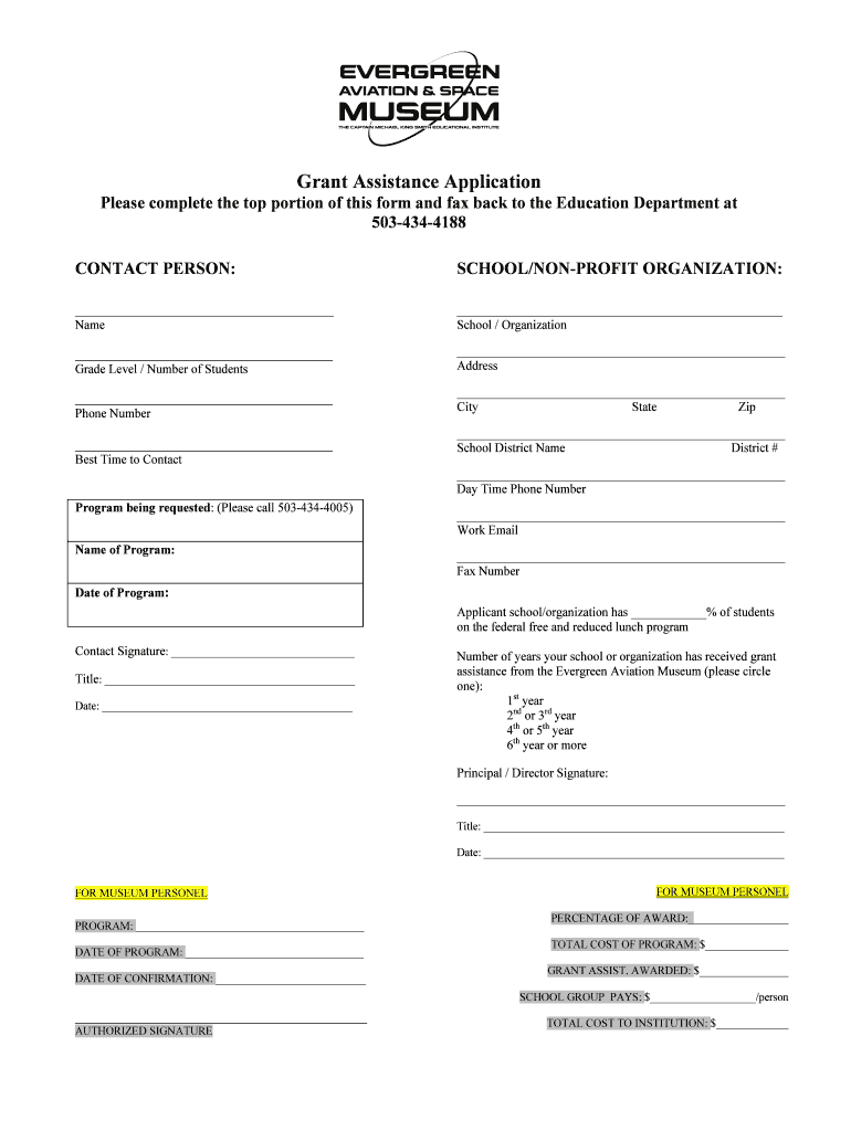 Grant Assistance Application Please complete the top portion of this form and fax back to the Education Department at 5034344188 CONTACT People: SCHOOL/NONPROFIT ORGANIZATION: Name School / Organization