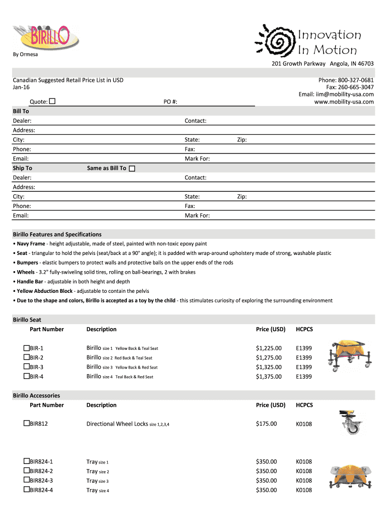 Burmese 201GrowthParkwayAngola,IN46703 Phone:8003270681 Fax:2606653047 Email:IIM mobilityusa.com www.mobilityusa.com CanadianSuggestedRetailPriceListinUSD Jan16 Quote: PO#: Bill Dealer: Contact: Address: