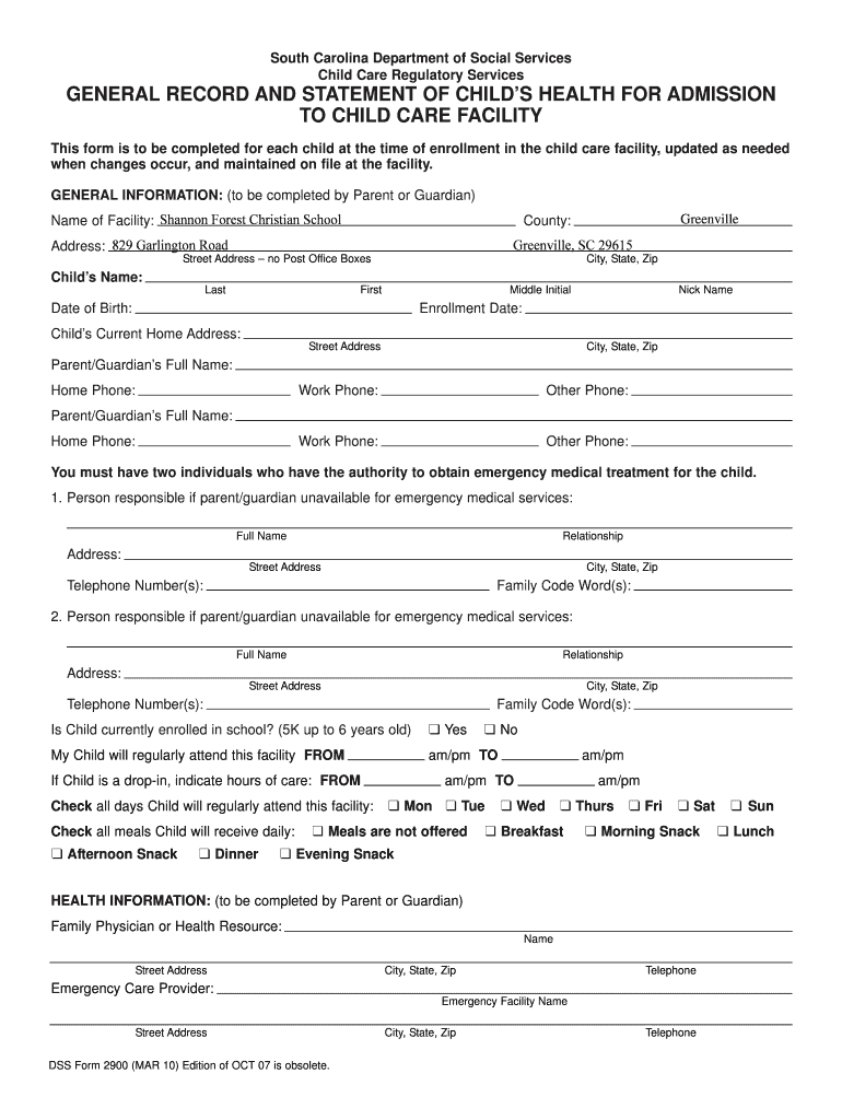 Reset South Carolina Department of Social Services Child Care Regulatory Services GENERAL RECORD AND STATEMENT OF CHILD HEALTH FOR ADMISSION TO CHILD CARE FACILITY This form is to be completed for