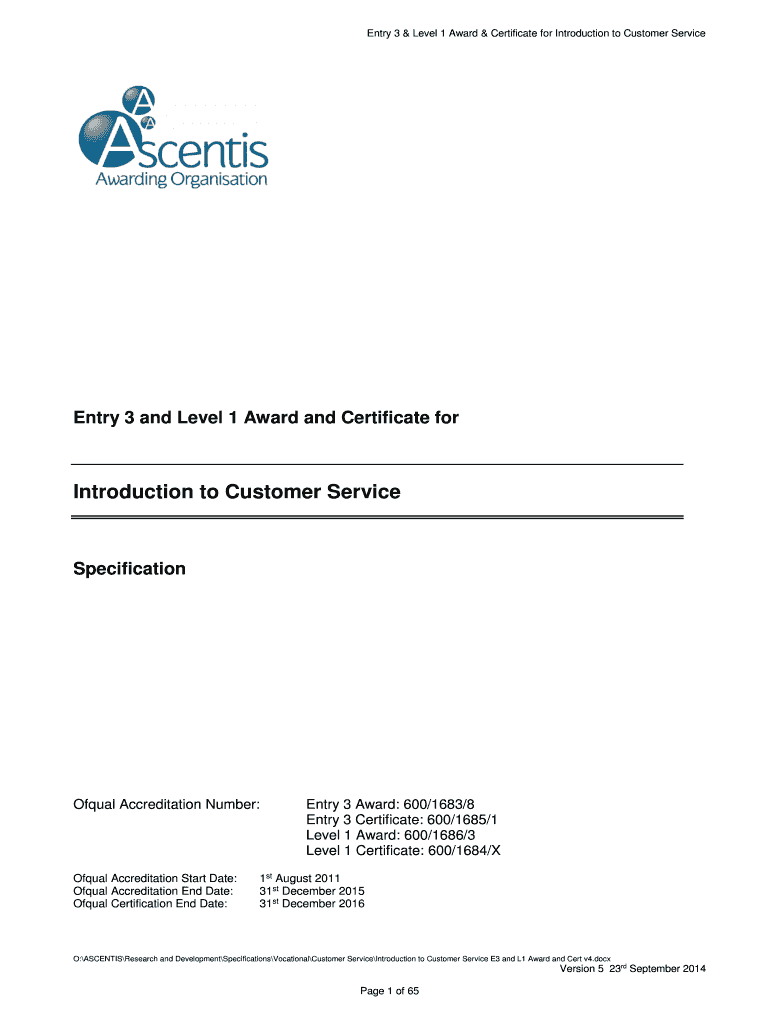 Entry 3 & Level 1 Award & Certificate for Introduction to Customer Service