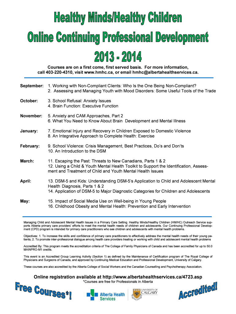 Courses are on a first come, first served basis. For more information, call 4032204310, visit www.hmhc.ca, or email MHC albertahealthservices.ca. September: 1. Working with NonCompliant Clients: Who