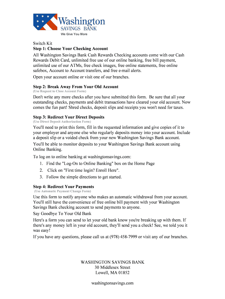 The Switch Kit is a comprehensive tool designed to facilitate the transfer of banking services, ensuring a smooth transition when moving from one financial institution to another. It includes essential forms that allow users to close old accounts, redirect direct deposits, and manage automatic payments.