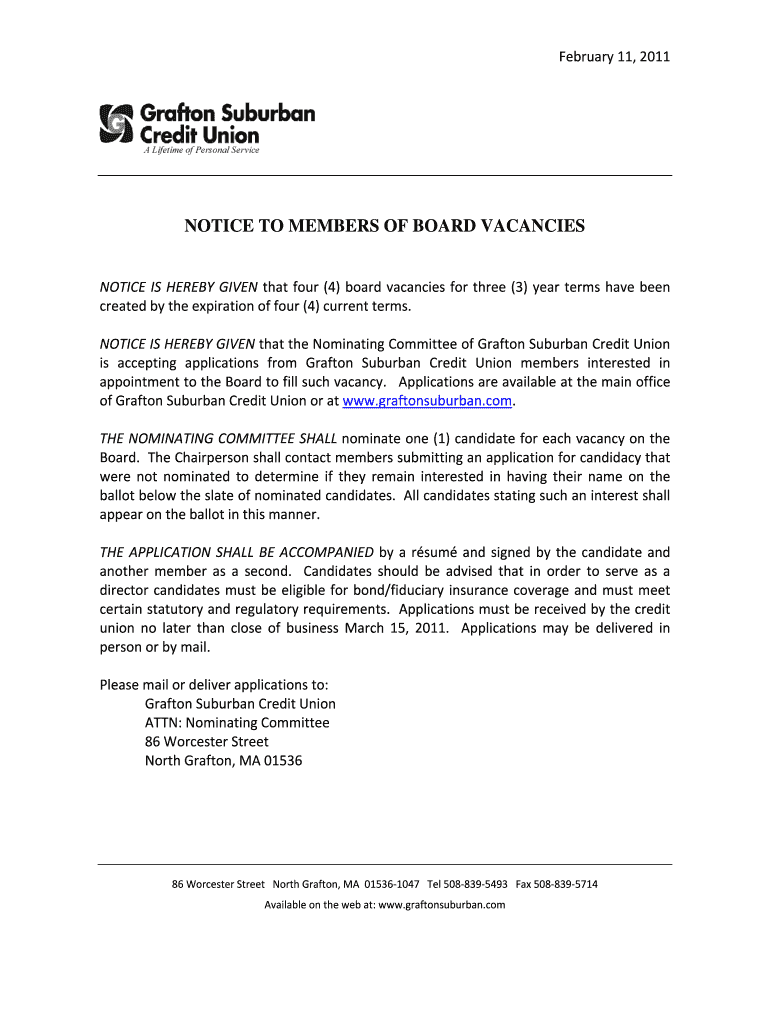 Get the free Notice to members of board vacancies - Grafton Suburban Credit ...