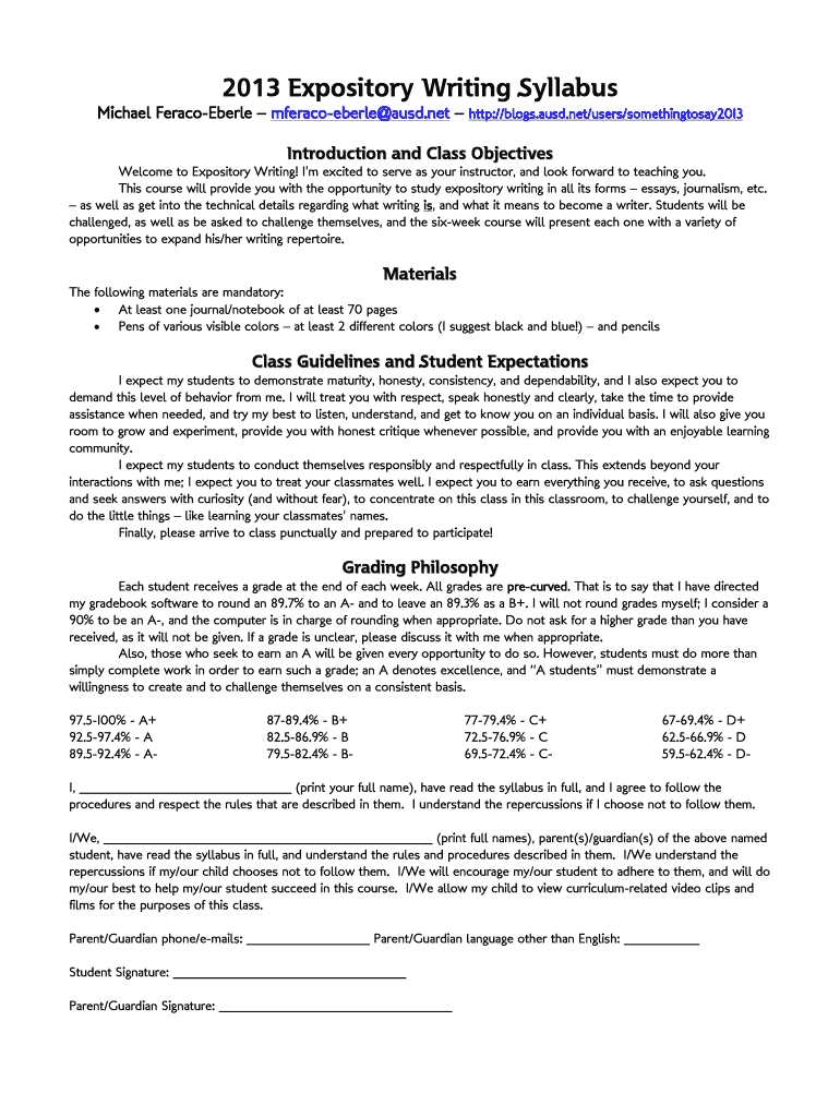 2013 Expository Writing Syllabus FeracoMichael FeracoEberle mferacoeberle ASD.net http://blogs.ausd.net/users/somethingtosay2013 Introduction and Class Objectives Welcome to Expository Writing! I'm