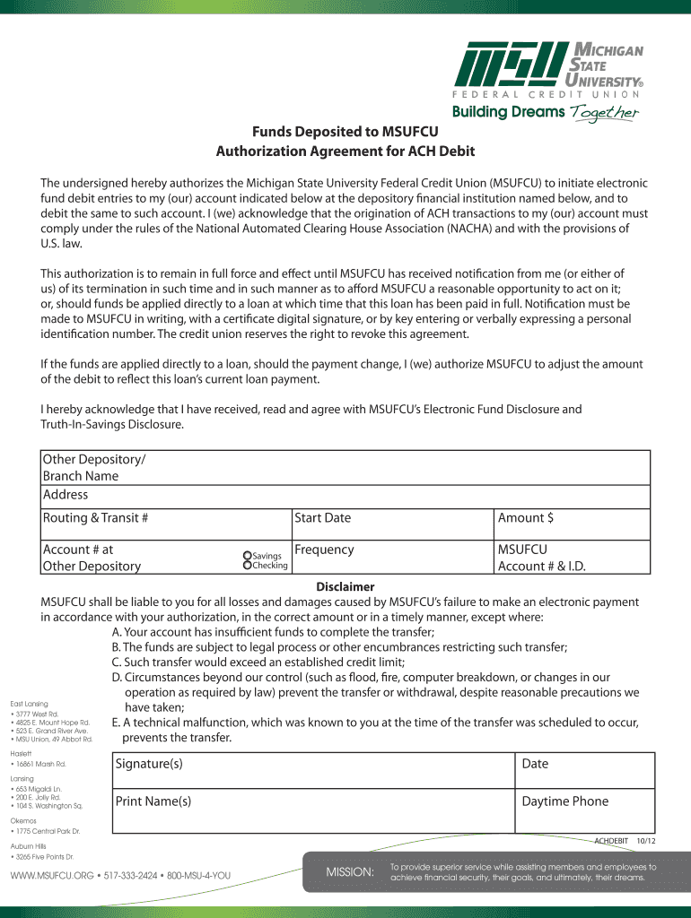 Submission of the MSUFCU ACH Debit Authorization Agreement can be completed through various methods:
