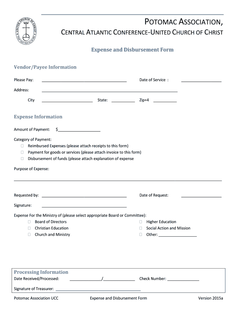 Potomac Association UCC Expense and Disbursement Form Version 2015a POTOMAC ASSOCIATION, CENTRAL ATLANTIC CONFERENCEUNITED CHURCH OF CHRIST