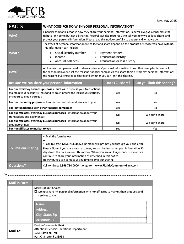 Rev. May 2015 FACTS WHAT DOES FCB DO WITH YOUR PERSONAL INFORMATION? Financial companies choose how they share your personal information. Federal law gives consumers the right to limit some but not