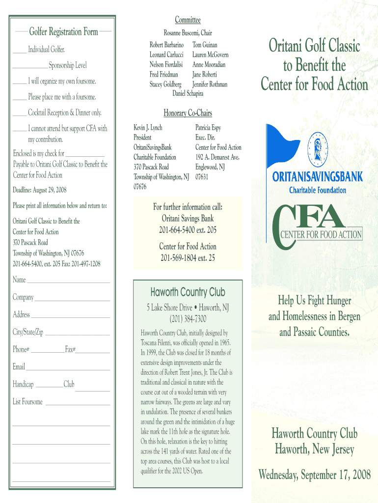 Committee Golfer Registration Form Individual Golfer. Sponsorship Level I will organize my own foursome. Please place me with a foursome. Cocktail Reception & Dinner only. I cannot attend but support