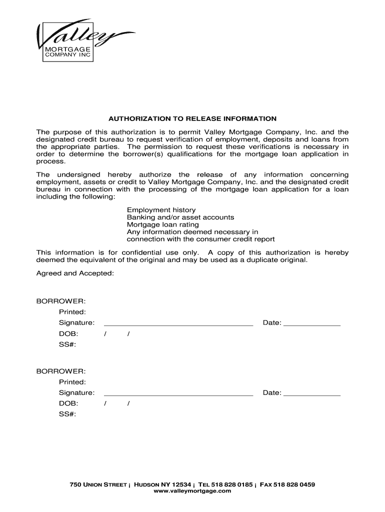 The Authorization to Release Information is a form utilized by borrowers to permit Valley Mortgage Company to verify essential financial information.