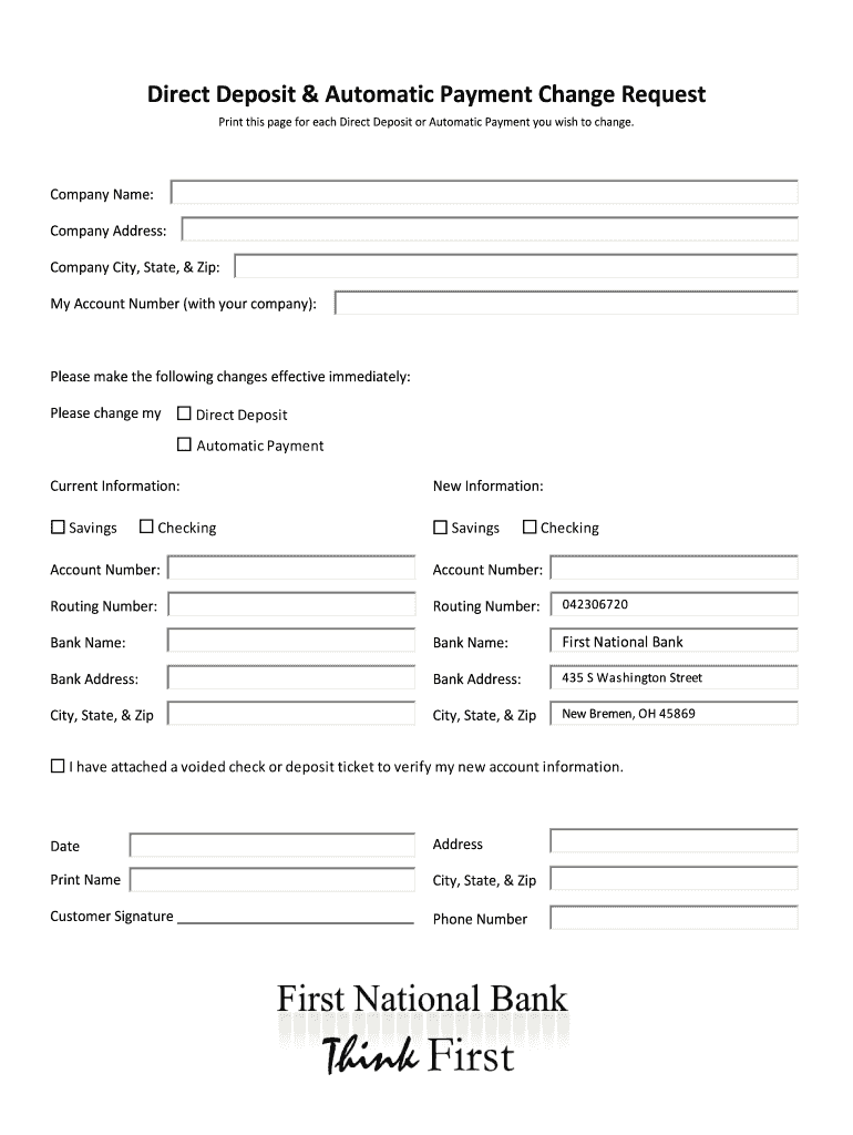 This document is used to request changes to direct deposit or automatic payment information with a company.