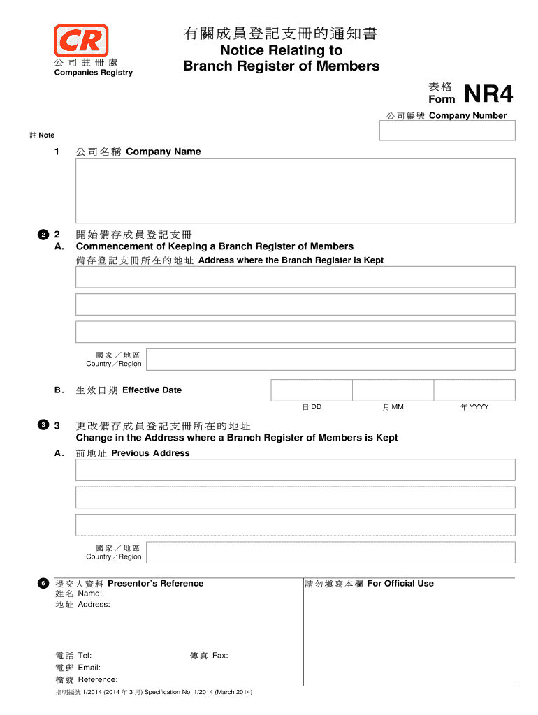 Companies Registry Notice Relating to Branch Register of Members Form NR4 Company Number Note 1 2 Company Name 2 A. Commencement of Keeping a Branch Register of Members Address where the Branch Register
