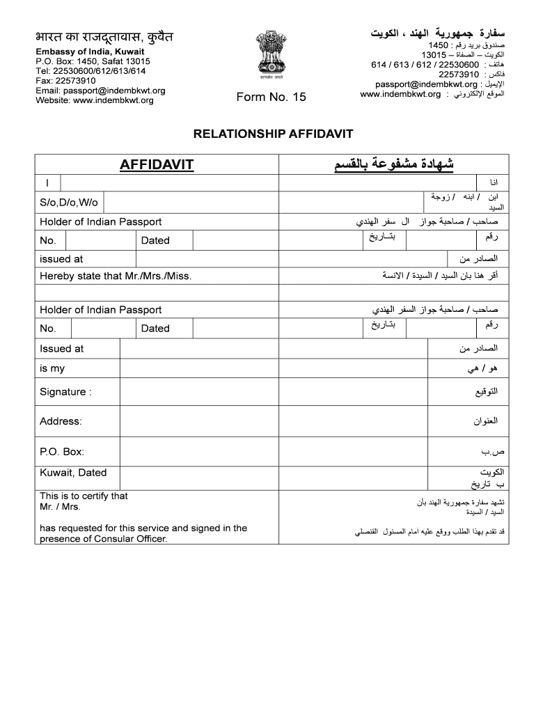 , Embassy of India, Kuwait P.O. Box: 1450, Sadat 13015 Tel: 22530600/612/613/614 Fax: 22573910 Email: passport indembkwt.org Website: www.indembkwt.org 1450 : 13015 614 / 613 / 612 / 22530600 : 22573910