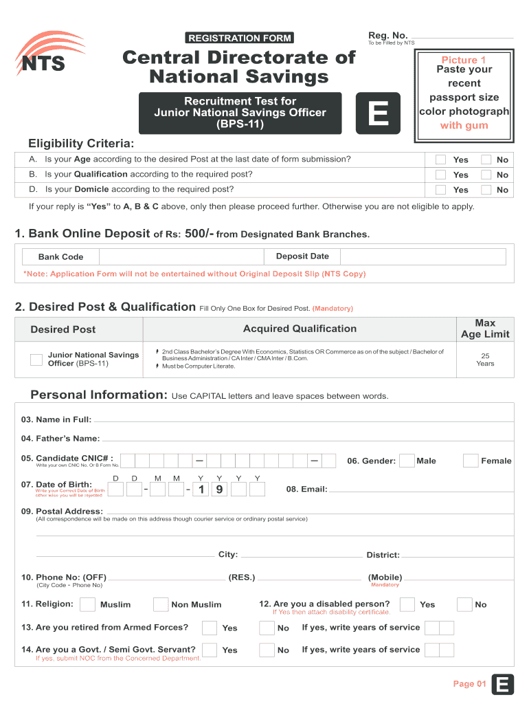 Reg. No. REGISTRATION FORM To be Filled by NTS Central Directorate of National Savings NTS Recruitment Test for Junior National Savings Officer (BPS11) E Picture 1 Paste your recent passport size