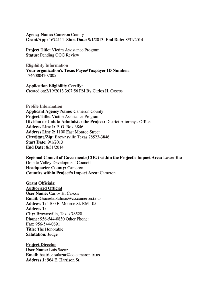 Agency Name: Cameron County Grant/App: 1674111 Start Date: 9/1/2013 End Date: 8/31/2014 Project Title: Victim Assistance Program Status: Pending DOG Review Eligibility Information Your organization's
