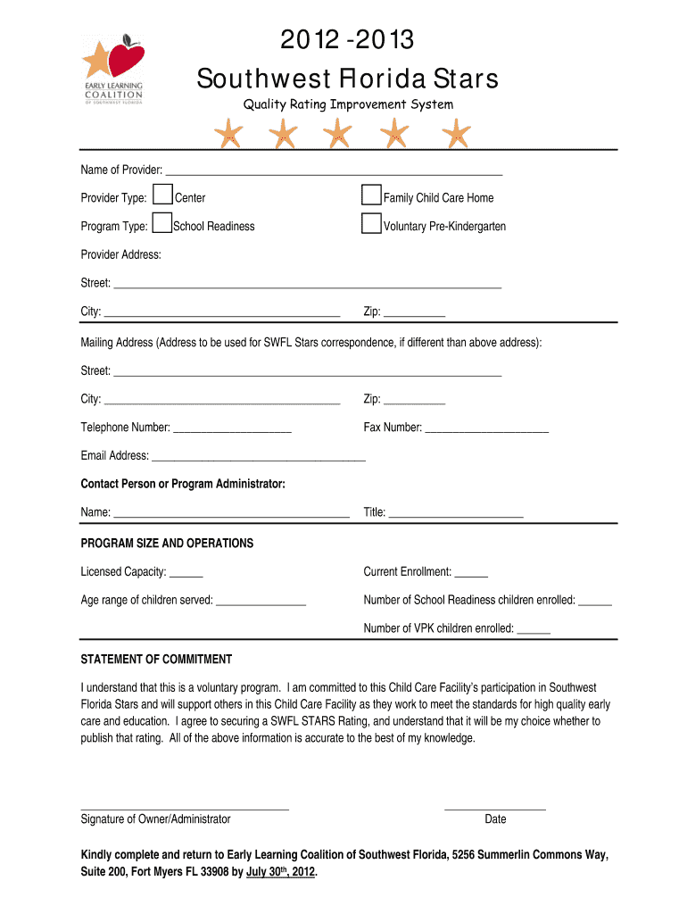 Get the free 2012 2013 Southwest Florida Stars Quality Rating Improvement System Name of Provider...