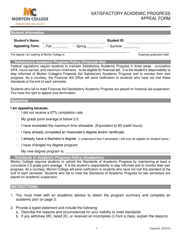 SATISFACTORY ACADEMIC PROGRESS APPEAL FORM Student Information Students Name: Appealing Term: Student ID: Fall Spring Summer The degree I am seeking at Morton College is Expected graduation date Satisfactory