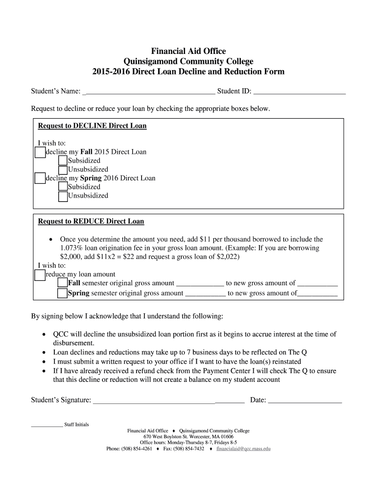 Financial Aid Office Quinsigamond Community College 20152016 Direct Loan Decline and Reduction Form Students Name: Student ID: Request to decline or reduce your loan by checking the appropriate boxes