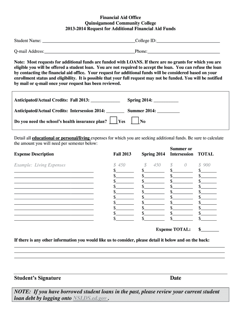 Financial Aid Office Quinsigamond Community College 20132014 Request for Additional Financial Aid Funds Student Name: College ID: Email Address: Phone: Note: Most requests for additional funds are