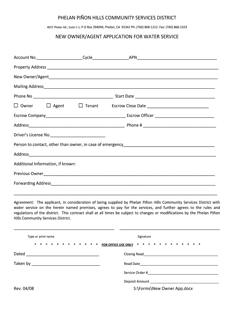Get the free NEW OWNERAGENT APPLICATION FOR WATER SERVICE - pphcsd