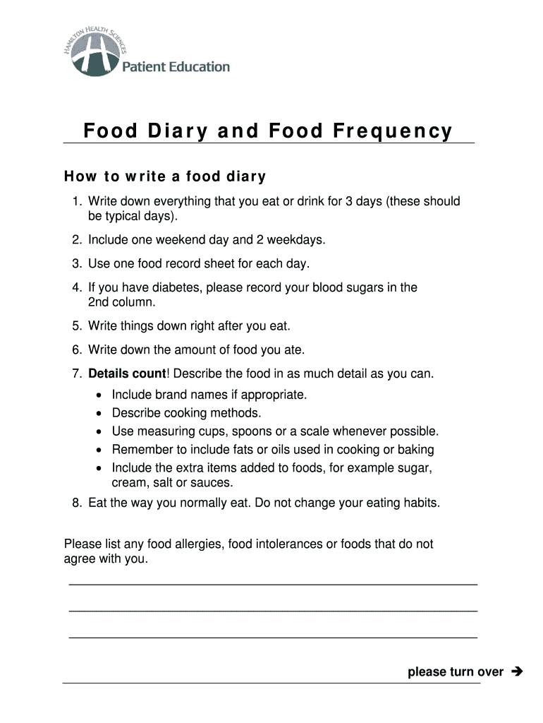 Food Diary and Food Frequency How to write a food diary 1. Write down everything that you eat or drink for 3 days (these should be typical days). 2. Include one weekend day and 2 weekdays. 3. Use