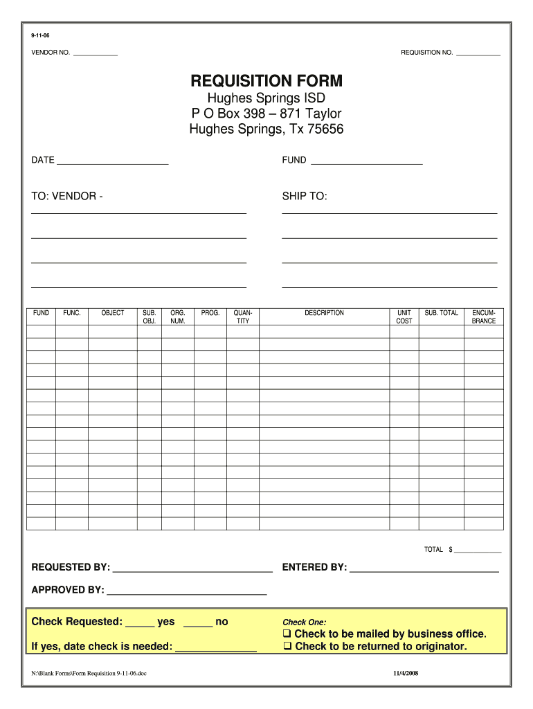 91106 Vendors NO. REQUISITION NO. REQUISITION FORM Hughes Springs ISD P O Box 398 871 Taylor Hughes Springs, TX 75656 DATE FUND TO: VENDOR SHIP TO: FUND FUN. OBJECT SUB. OBJ. ORG. SUM. PRO. QUANTITY