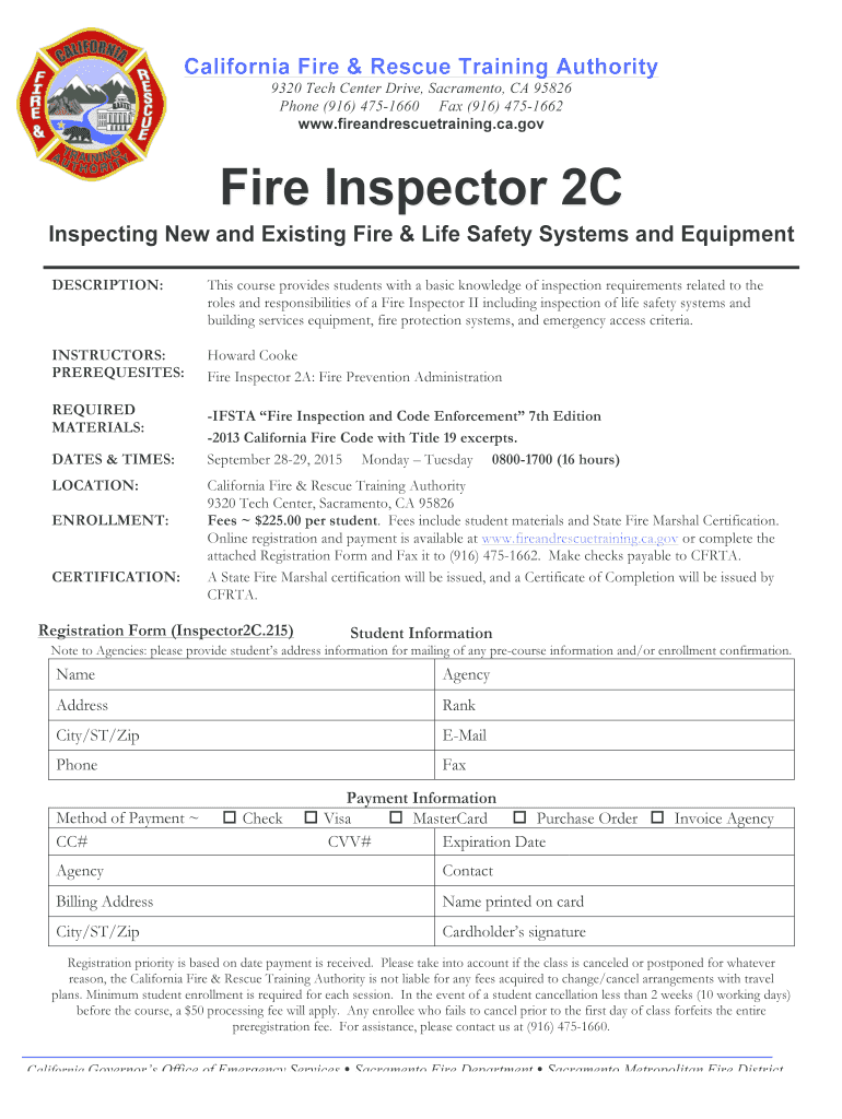 California Fire & Rescue Training Authority 9320 Tech Center Drive, Sacramento, CA 95826 Phone (916) 4751660 Fax (916) 4751662 www.fireandrescuetraining.ca.gov Fire Inspector 2C Inspecting New and