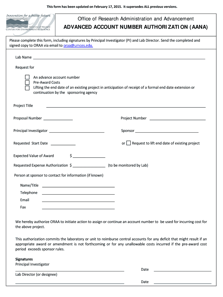 This form has been updated on February 17, 2015. It supersedes ALL previous versions. Office of Research Administration and Advancement ADVANCED ACCOUNT NUMBER AUTHORIZATION (ANNA) Please complete