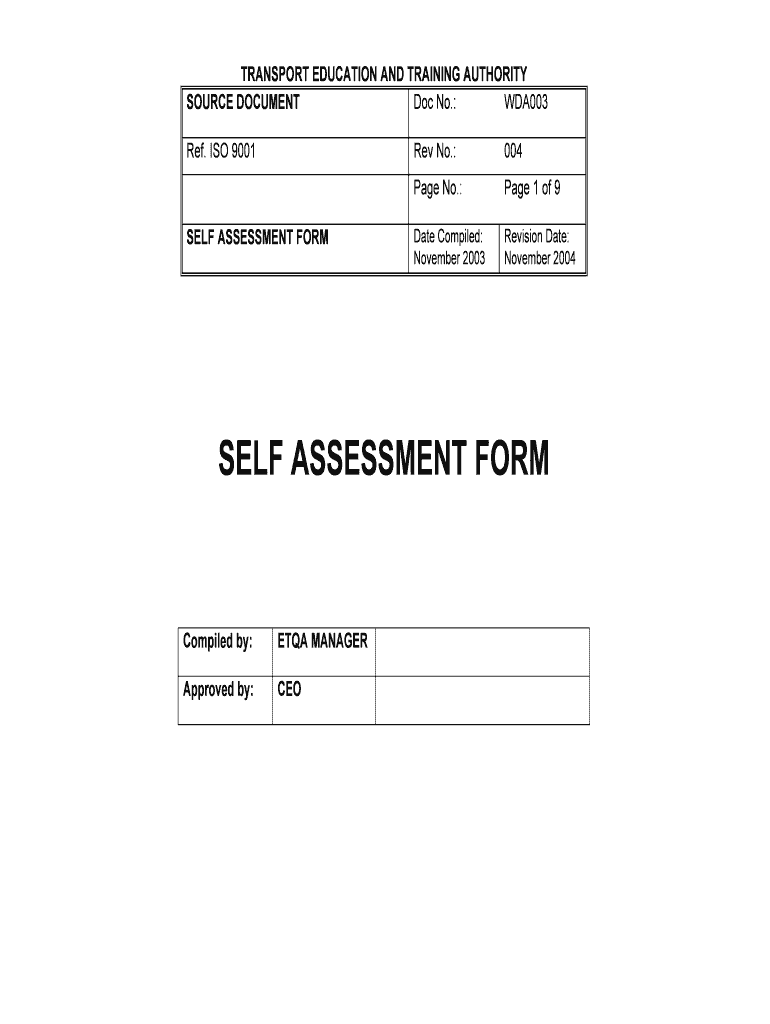 TRANSPORT EDUCATION AND TRAINING AUTHORITY Doc No.: WDA003 SOURCE DOCUMENT Ref. ISO 9001 Rev No.: Page No.: SELF ASSESSMENT FORM 004-Page 1 of 9 Date Compiled: November 2003 Revision Date: November