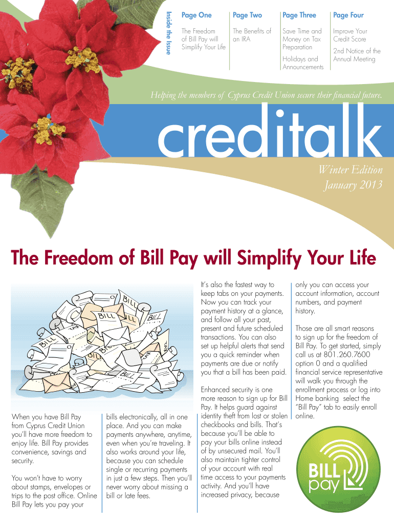 This document is a winter edition newsletter from Cyprus Credit Union, providing information on various financial services, benefits of IRA, credit score improvement tips, and community support initiatives.
