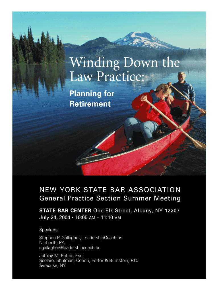 Winding Down the Law Practice: Planning for Retirement NEW YORK STATE BA R ASS OCI AT I O N General Practice Section Summer Meeting S TATE BAR CENTER One Elk Street, Albany, NY 12207 July 24, 2004
