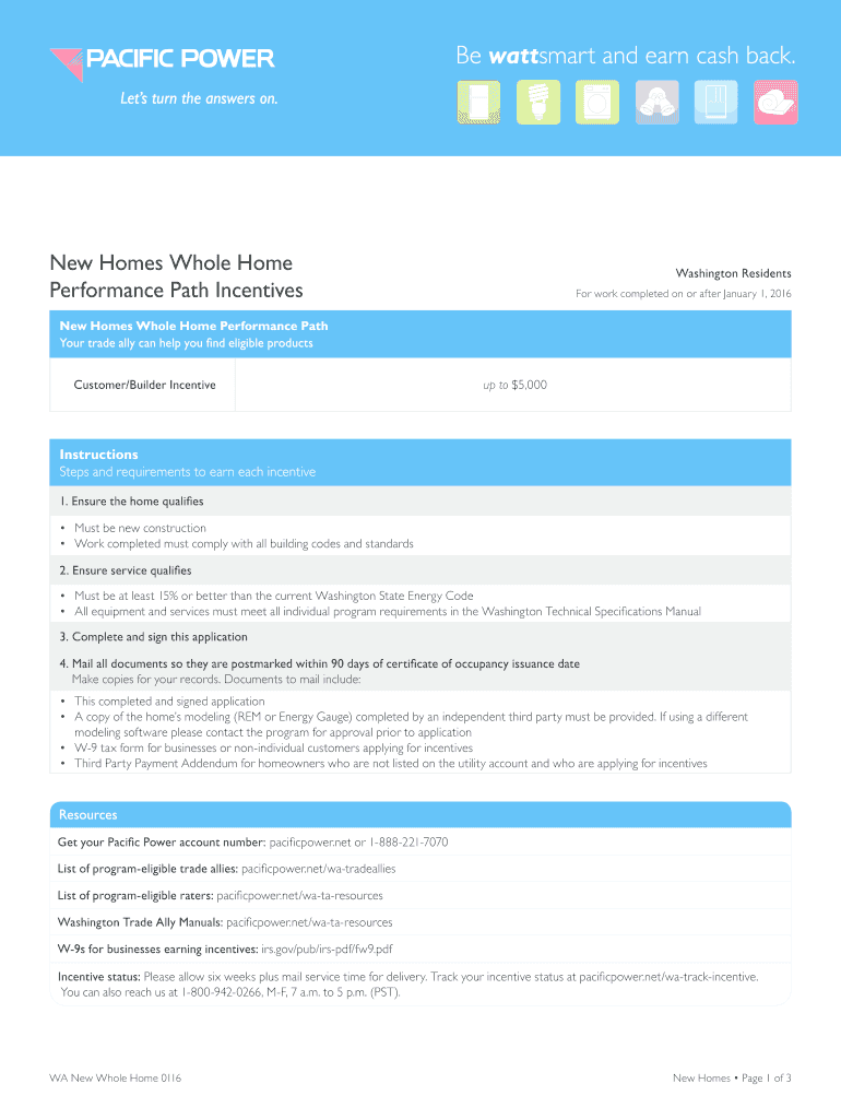 Be watt smart and earn cash back. New Homes Whole Home Performance Path Incentives Washington Residents For work completed on or after January 1, 2016, New Homes Whole Home Performance Path Your trade