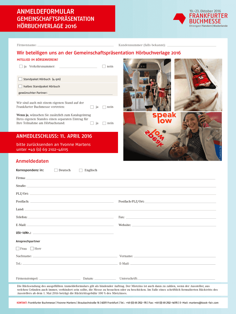 ANMELDEFORMULAR GEMEINSCHAFTSPRSENTATION HRBUCHVERLAGE 2016 Profiteered She on unseen Lasting / Au fund Abbey Frankfurter Burmese / Peter Birth / Stands child MIT Verlagsnamen / Informationstheke