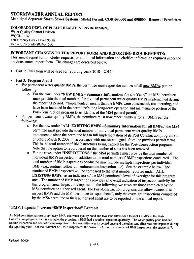 STORM WATER ANNUAL REPORT Municipal Separate Storm Sewer Systems (MS4s) Permit, COR 080000 and 090000 Renewal Pernilitees COLOR AI)() l)EPT. OF P(JB LIC HEALTH & ENVIRONMENT Water Quality Corn ml
