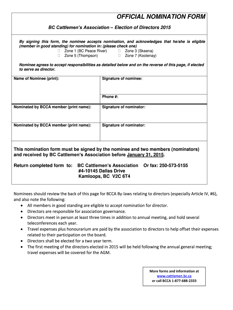 OFFICIAL NOMINATION FORM BC Cattlemen Association Election of Directors 2015 By signing this form, the nominee accepts nomination, and acknowledges that he/she is eligible (member in good standing)