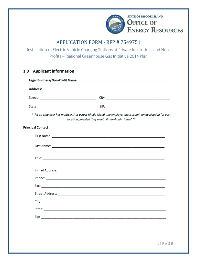 APPLICATION FORM RFP # 7549751 Installation of Electric Vehicle Charging Stations at Private Institutions and Nonprofits Regional Greenhouse Gas Initiative 2014 Plan 1.0 Applicant information Legal