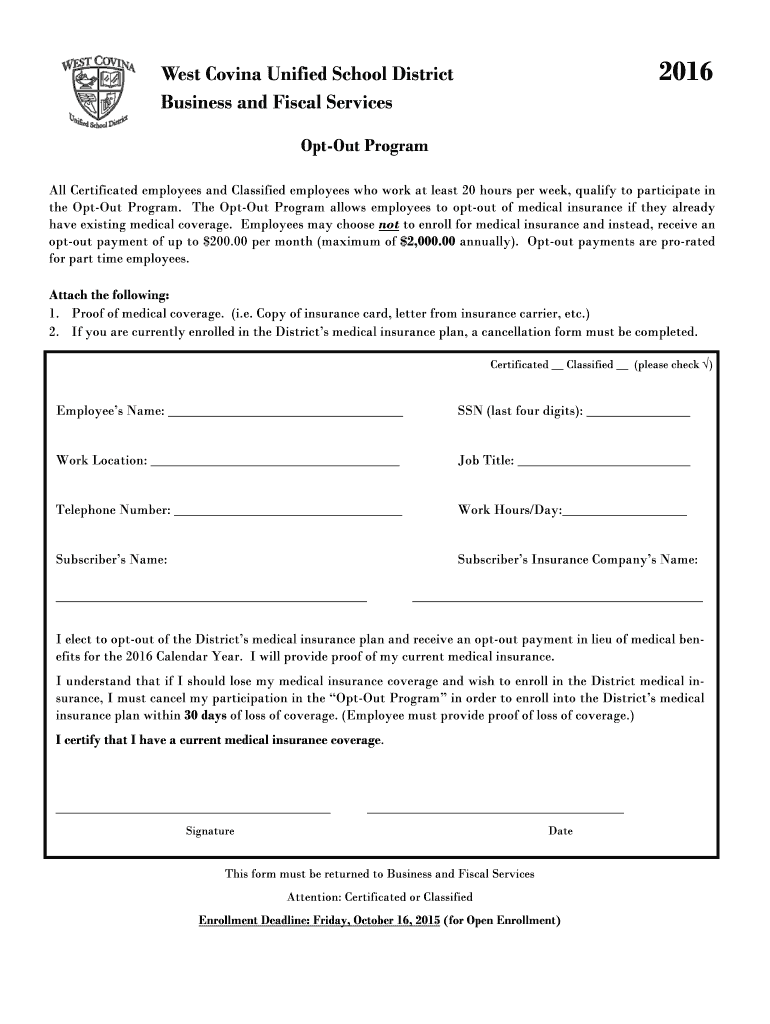 Get the free 2016 West Covina Unified School District Business and Fiscal Services OptOut Program...