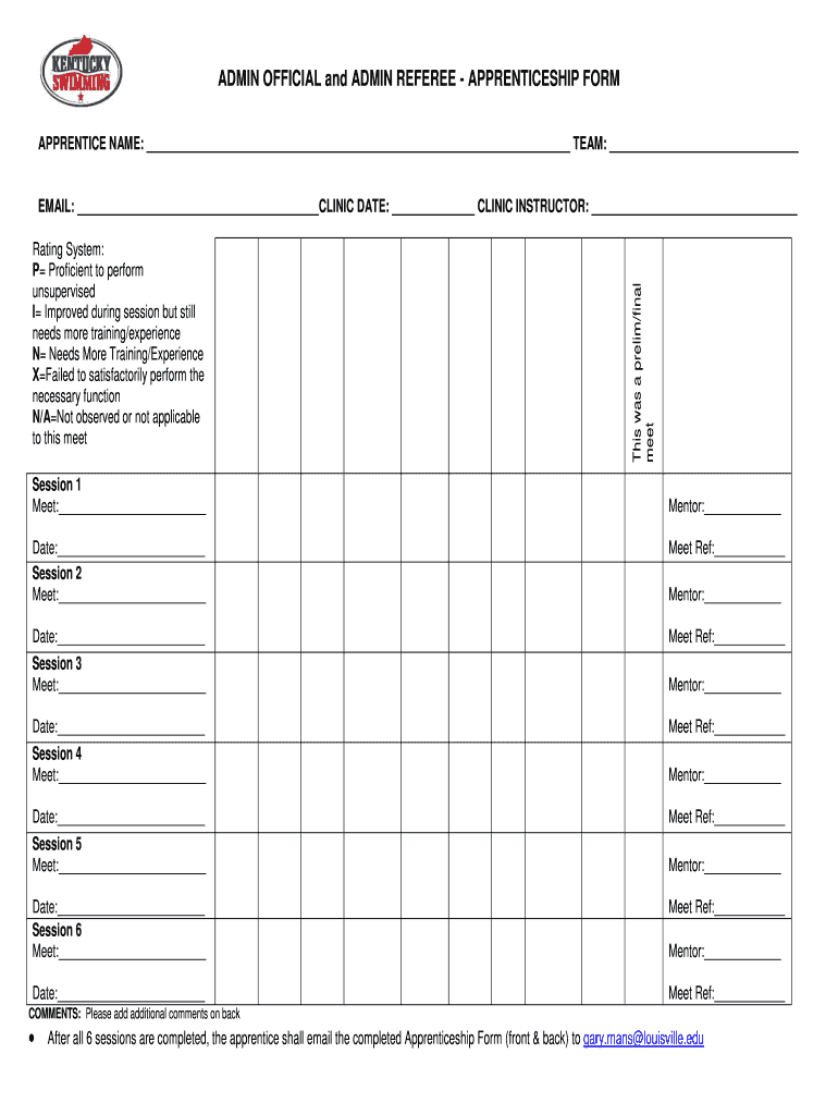 ADMIN OFFICIAL and ADMIN REFEREE APPRENTICESHIP FORM APPRENTICE NAME: TEAM: Rating System: P Proficient to perform unsupervised I Improved during session but still needs more training/experience N
