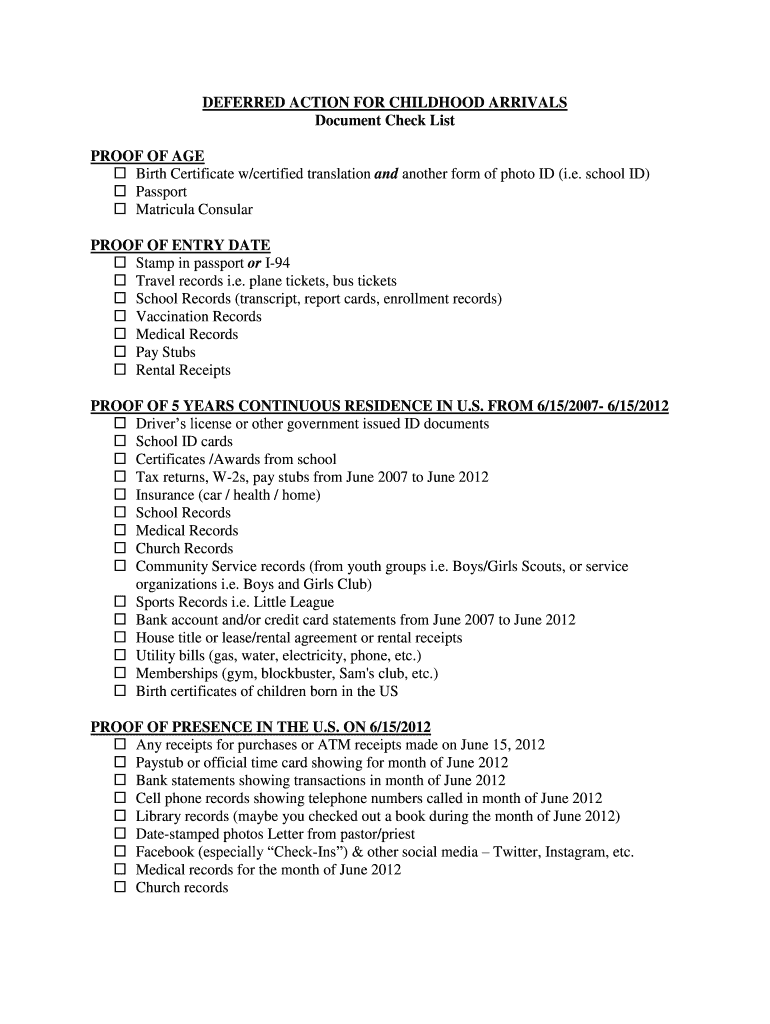 Get the free Deferred Action for Childhood Arrivals Checklist