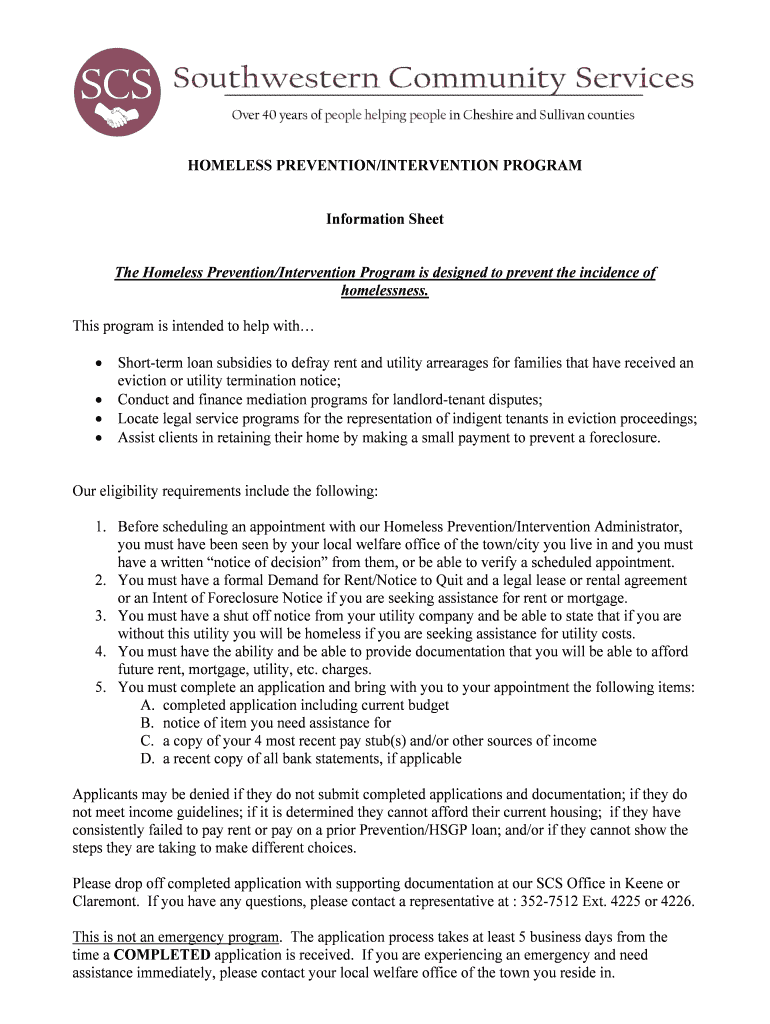 HOMELESS PREVENTION/INTERVENTION PROGRAM Information Sheet The Homeless Prevention/Intervention Program is designed to prevent the incidence of homelessness. This program is intended to help with