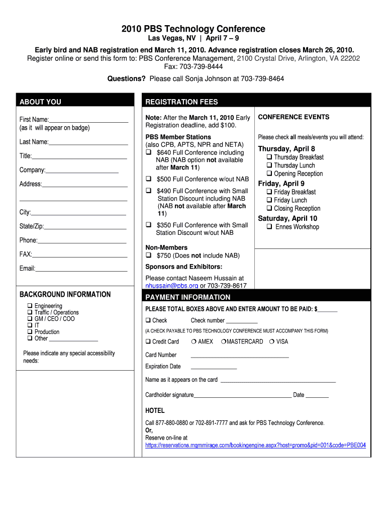 To fill out the 2010 PBS Technology Conference Registration, attendees must provide their personal or organizational information, select their attendance days, and submit any required fees as specified in the registration form.