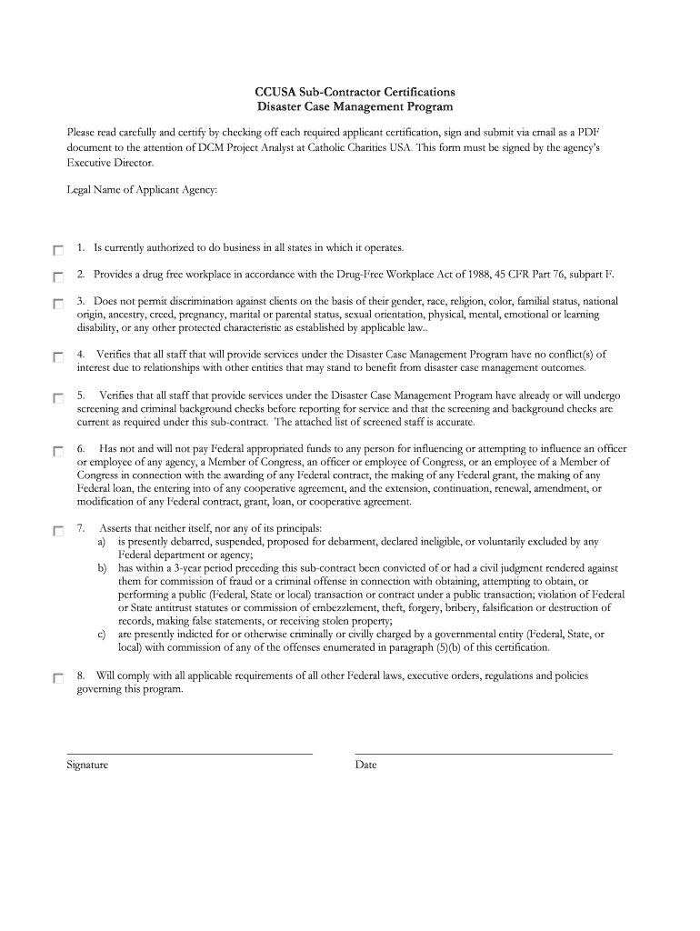 Get the free CCUSA Sub-Contractor Certifications - dcmteam catholiccharitiesusa