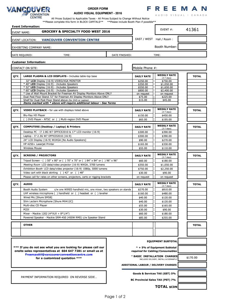 ORDER FORM AUDIO VISUAL EQUIPMENT 2016 All Prices Subject to Applicable Taxes All Prices Subject to Change Without Notice **Please complete this form in BLOCK CAPITALS** **Please include Booth Plan