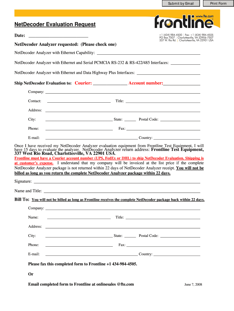 Submit by Email Decoder Evaluation Request Date: Decoder Analyzer requested: (Please check one) Decoder Analyzer with Ethernet Capability: Decoder Analyzer with Ethernet and Serial PCMCIA RS232 &