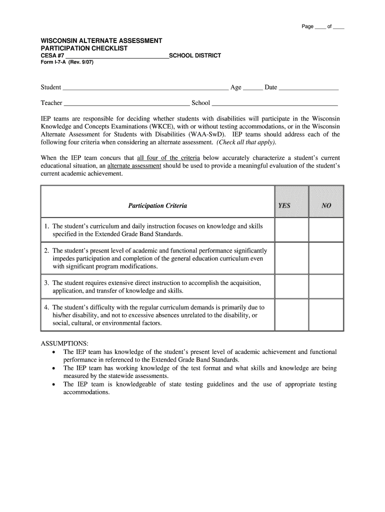 Page of WISCONSIN ALTERNATE ASSESSMENT PARTICIPATION CHECKLIST CSA #7 SCHOOL DISTRICT Form I7A (Rev. 9/07) Student Age Date Teacher School IEP teams are responsible for deciding whether students with