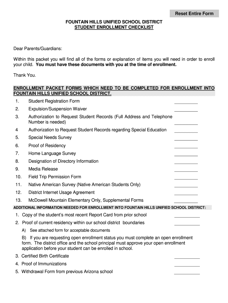 FOUNTAIN HILLS UNIFIED SCHOOL DISTRICT ENROLLMENT PACKET FOUNTAIN HILLS MIDDLE SCHOOL FOUR PEAKS ELEMENTARY PACKETS SHOULD BE COMPLETED IN FULL. ENROLLMENT PACKETS MUST BE ACCOMPANIED BY THE FOLLOWING