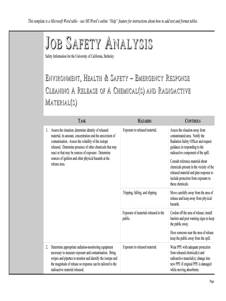 This template is a Microsoft Word table use MS Words online Help feature for instructions about how to add text and format tables. J OB S SAFETY A ANALYSIS Safety Information for the University of
